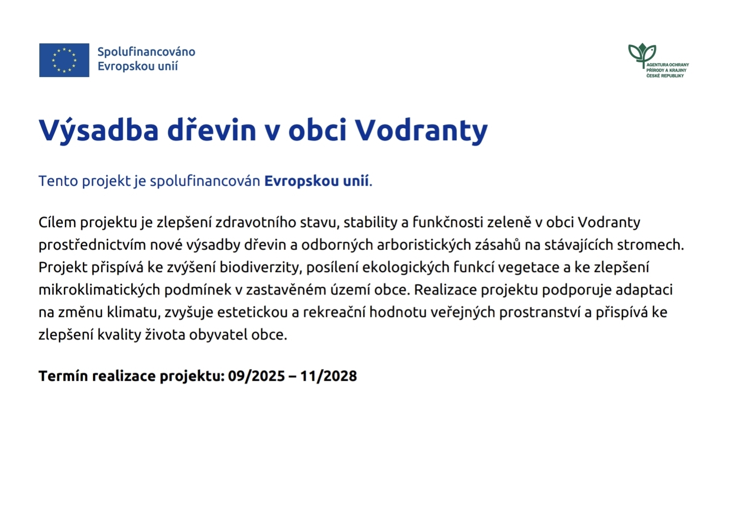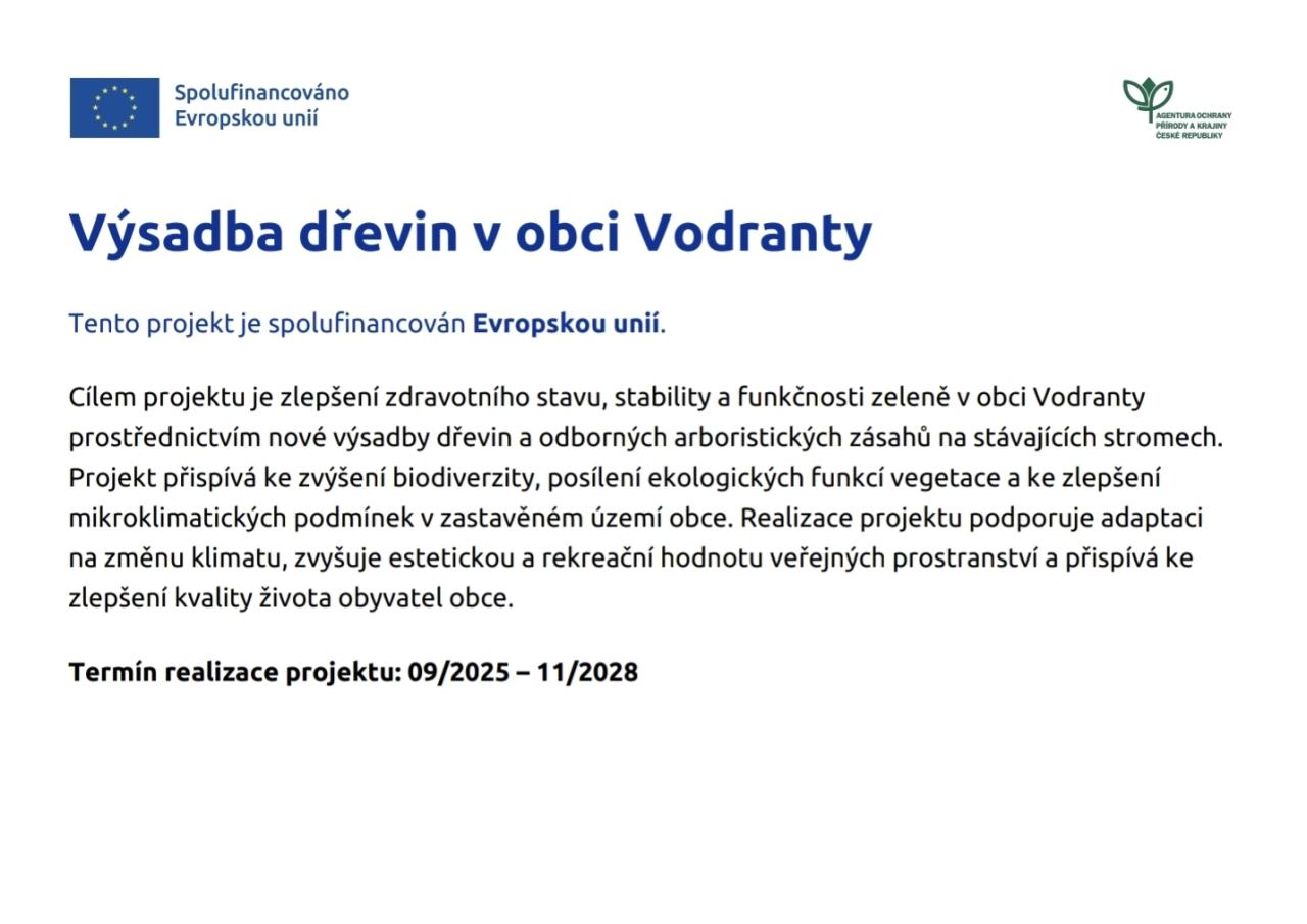 Cílem projektu je výsadba dřevin, tříletá následná péče o vysazené dřeviny a provedení arboristických zásahů v obci Vodranty. Realizací arboristických zásahů bude dosaženo výrazného prodloužení existence ošetřovaných dřevin, což má za následek pozitivní rozvoj lokality v rámci ekologické stability krajiny. Výsadba dřevin povede ke zvýšení rozlohy zeleně ve veřejném prostoru dané obce. Projekt je podpořen AOPK ČR v 9. výzvě SC 1.3 OPŽP.