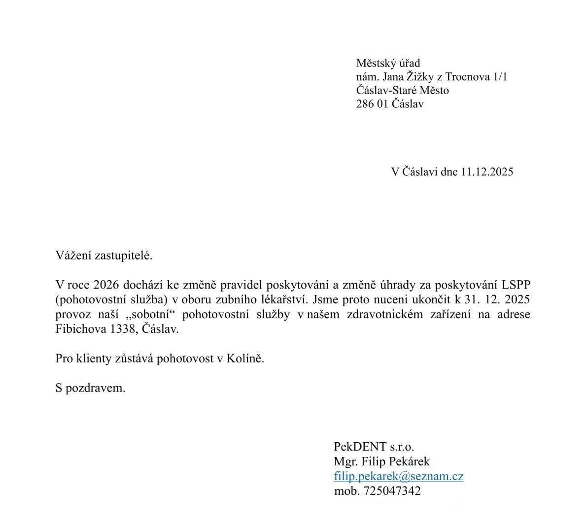 Ukončení "sobotní" zubní pohotovosti v Čáslavi k 31. 12. 2025